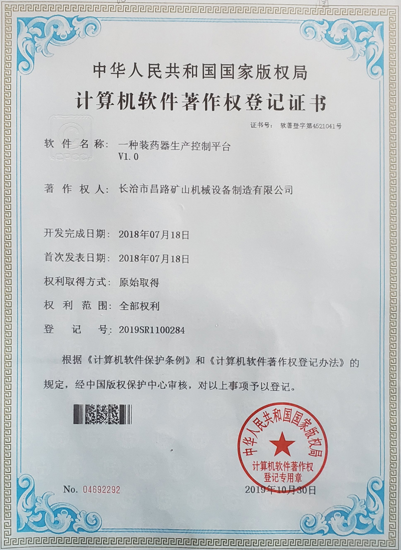 榮獲裝藥器生產(chǎn)控制平臺(tái)著作權(quán)登記證書(shū)